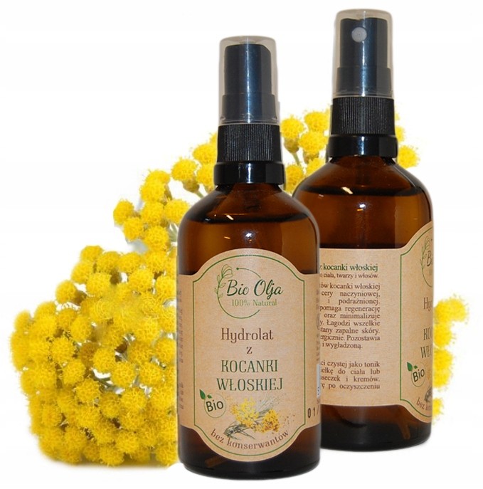 Hydrolat z kwiatów z kocanki włoskiej firmy Bio Olja, podobnie jak olejek eteryczny, ma wiele, wiele zastosowań. Polecany jest dla cery naczynkowej i wrażliwej. Jest to jeden z najsilniejszych hydrolatów przeciwzapalnych.