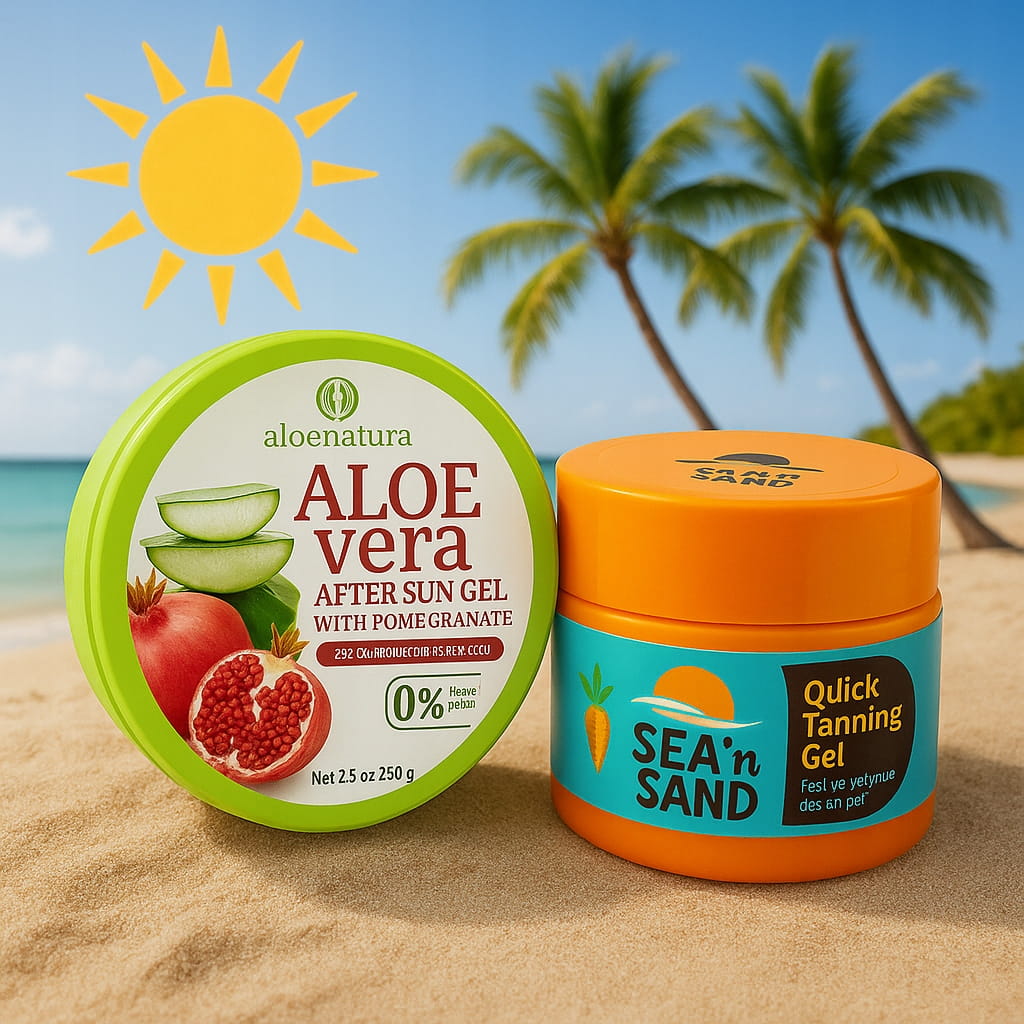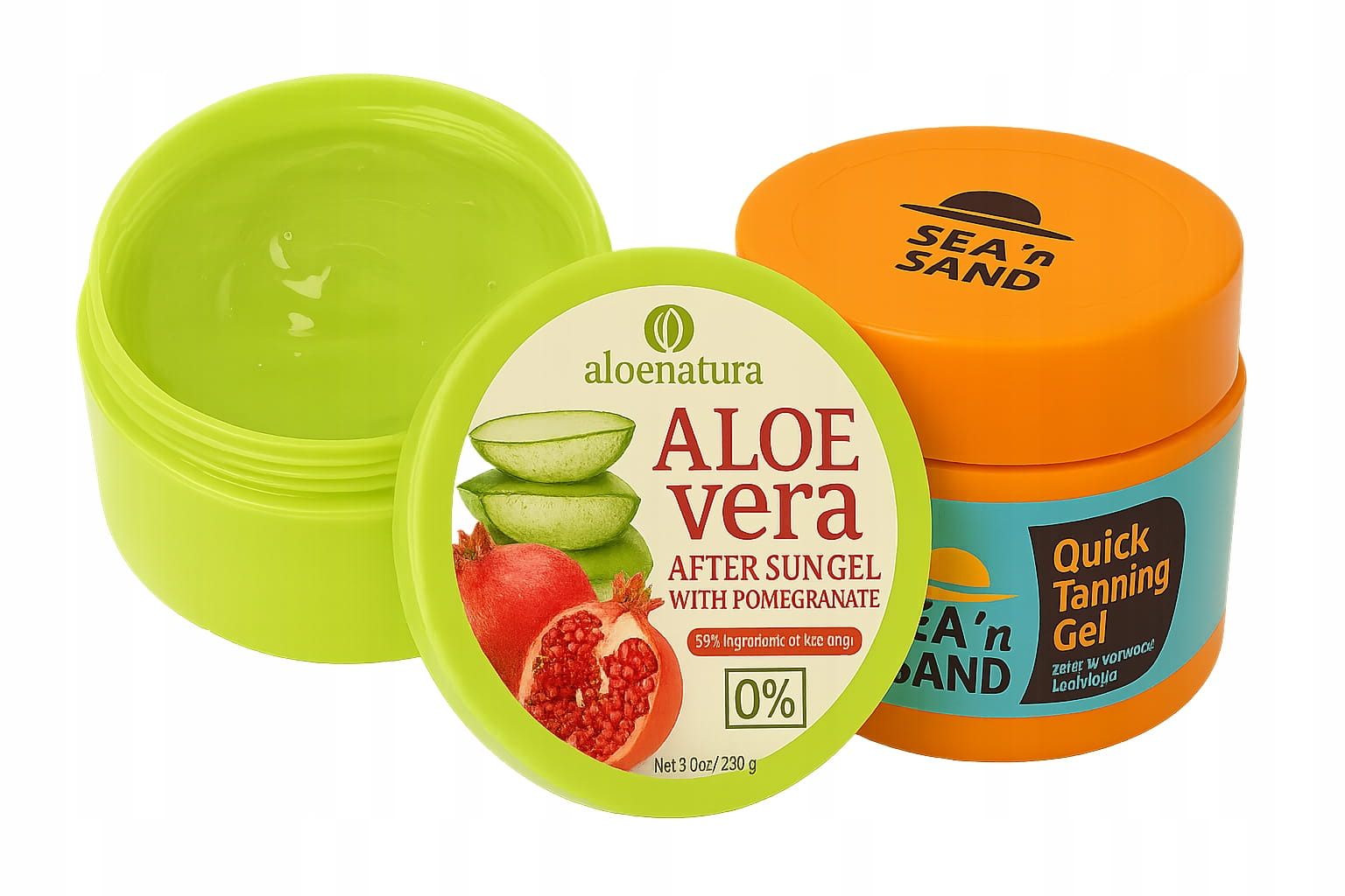 Greckie opalanie - wakacyjny zestaw: Sea 'n' Sand Przyspieszacz opalania w żelu bez filtrów UV 170ml + Aloe Natura Nawilżający żel po opalaniu aloes i granat 200ml