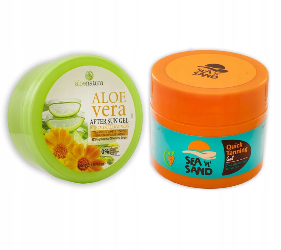Grecki zestaw do opalania: Sea 'n' Sand Przyspieszacz opalania w żelu bez filtrów UV 170ml + Aloe Natura Nawilżający żel po opalaniu aloes i nagietek 200ml