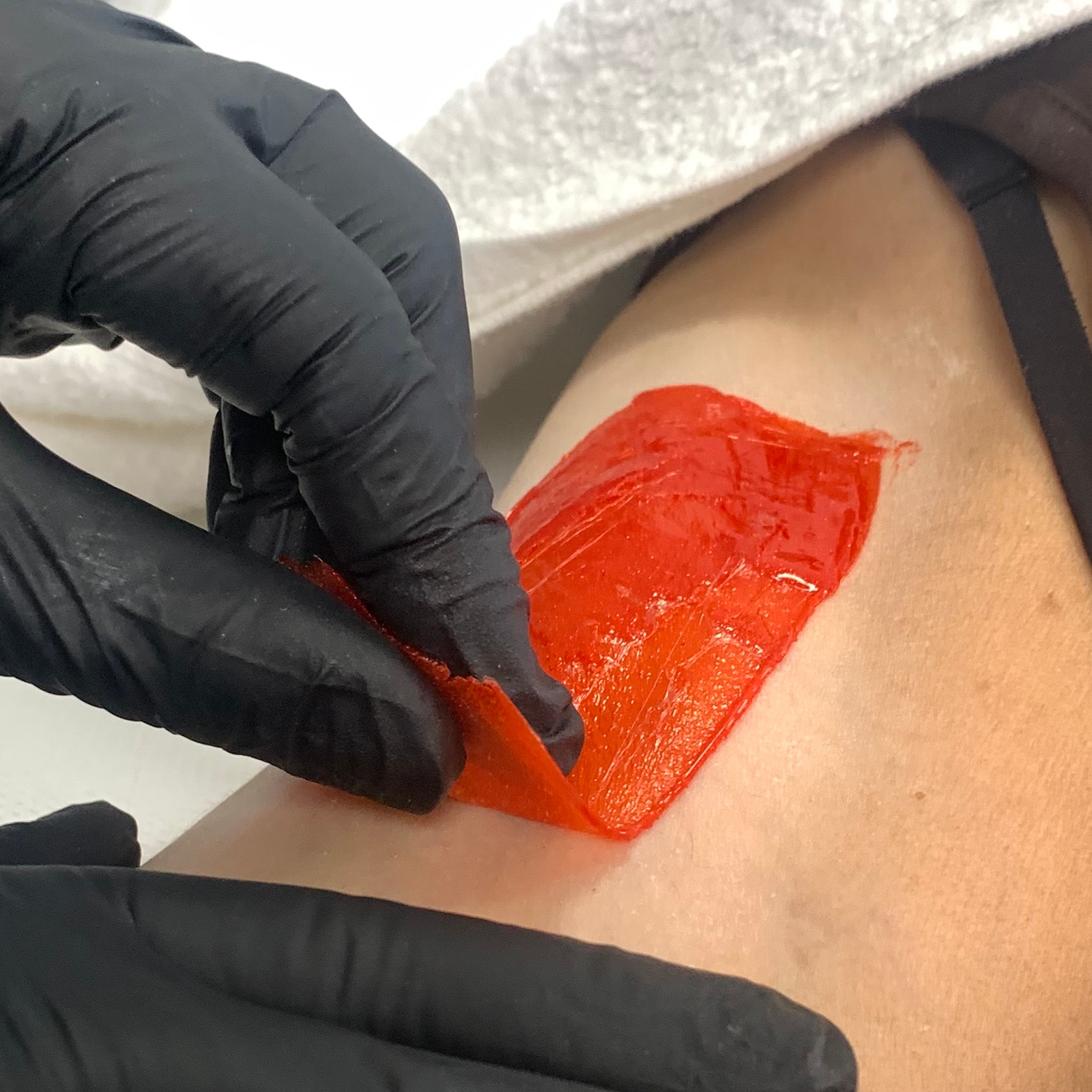 - Trzymając skórę naprężoną w kierunku przeciwnym do odrywania, szybko usuń wosk równolegle do skóry. Powtórz procedurę na kolejnym obszarze.