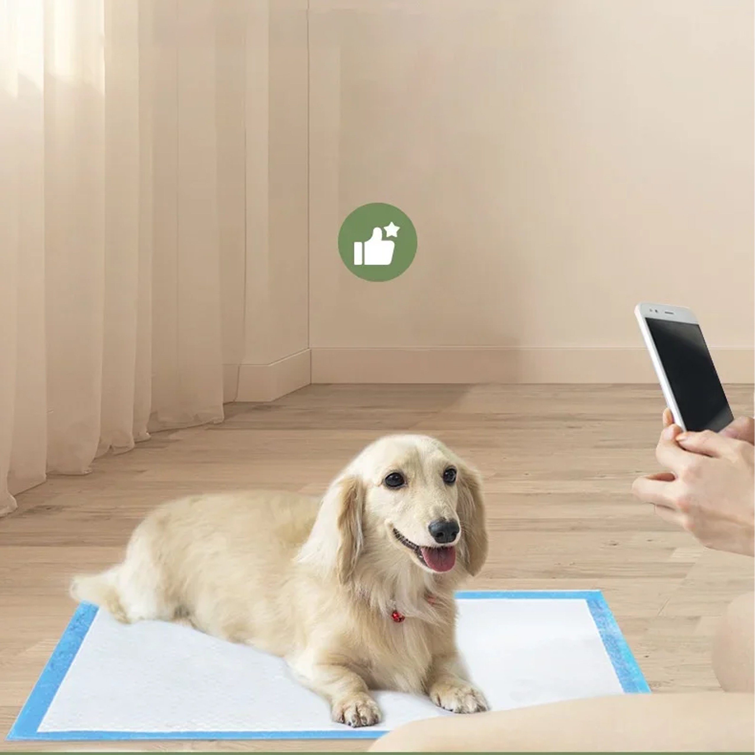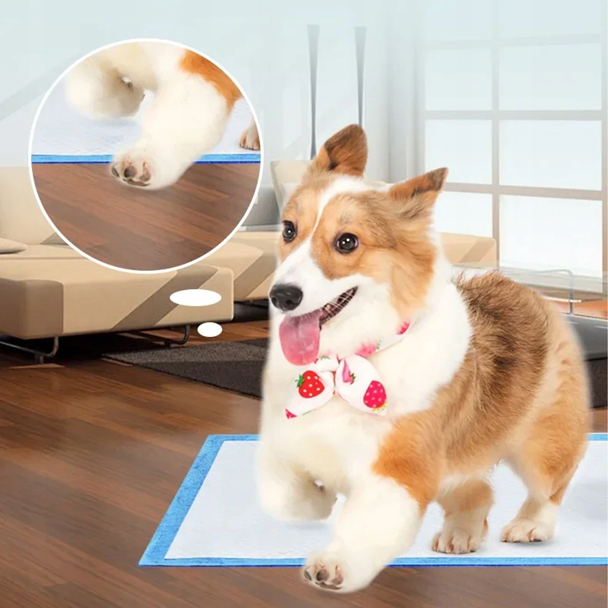 - Rozłóż matę płasko – umieść podkład białą włókninową stroną do góry, niebieską folią do dołu; upewnij się, że mata leży równo i nie fałduje się – duże rasy chodzą po macie energiczniej niż małe psy.