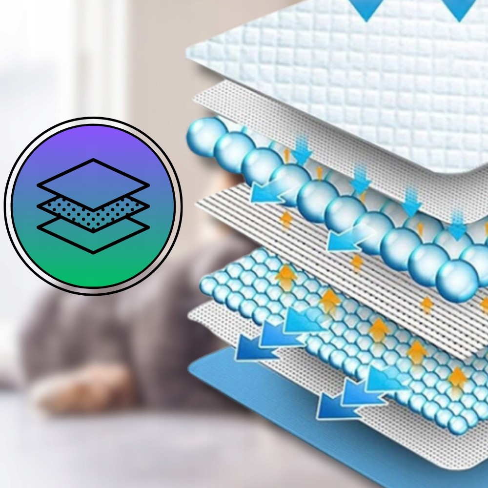 Budowa maty od góry do dołu: sucha włóknina (kontakt z łapami zwierzęcia) → bibułka (wstępne wchłanianie) → granulki SAP (pełna absorpcja i żelowanie cieczy) → puszysta miazga celulozowa (dodatkowa pojemność chłonna i warstwa antyzapachowa) → bibułka + folia zabezpieczająca (szczelna bariera przed wyciekiem na podłogę). Taka struktura sprawia, że mata skutecznie radzi sobie nawet z bardzo dużą objętością moczu, charakterystyczną dla dużych ras psów, takich jak labrador czy owczarek.