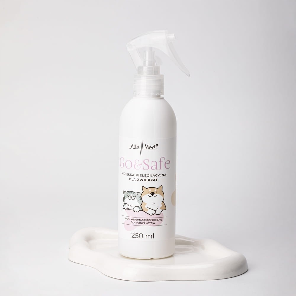 - ✓ Lekka formuła mgiełki – szybko się wchłania, nie pozostawia tłustości i lepkości na sierści – AlleMed Go&Safe nie skleja i nie obciąża sierści nawet przy codziennym stosowaniu; aplikacja jest szybka i przyjemna zarówno dla właścicielki, jak i dla pupila, a sierść po wyschnięciu wygląda naturalnie i czystości.