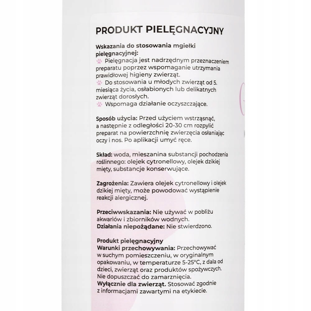 - Omijaj newralgiczne obszary – unikaj bezpośredniego kontaktu mgiełki z oczami, nosem, uszami i błonami śluzowymi; okolice głowy aplikuj pośrednio, nanosząc preparat na dłoń i delikatnie wcierając w sierść wokół głowy i szyi zwierzęcia.