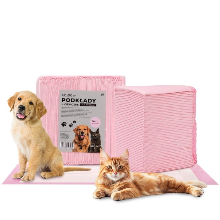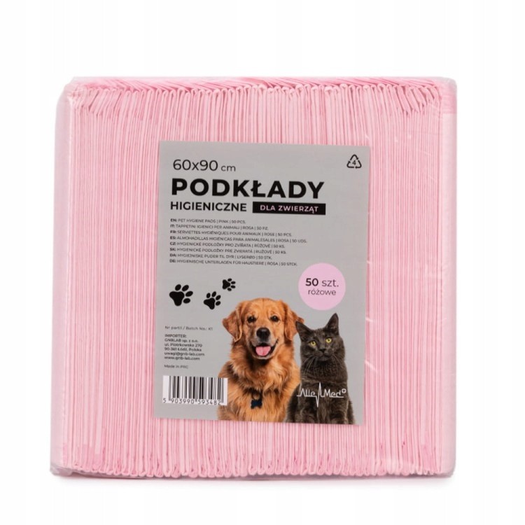 Podkłady higieniczne AlleMed 60x90 cm różowe 50 sztuk to wersja o identycznych właściwościach użytkowych co model 100-sztukowy, dostępna w mniejszej ilości – skierowana do właścicieli, którzy dopiero przechodzą na duży format 60x90 cm z mniejszych modeli AlleMed (40x60 cm lub 60x60 cm), kupują maty nieregularnie lub potrzebują poręcznego zapasu na konkretny cel: podróż, wystawę, wizytę u weterynarza lub kilkutygodniową rekonwalescencję psa po operacji.