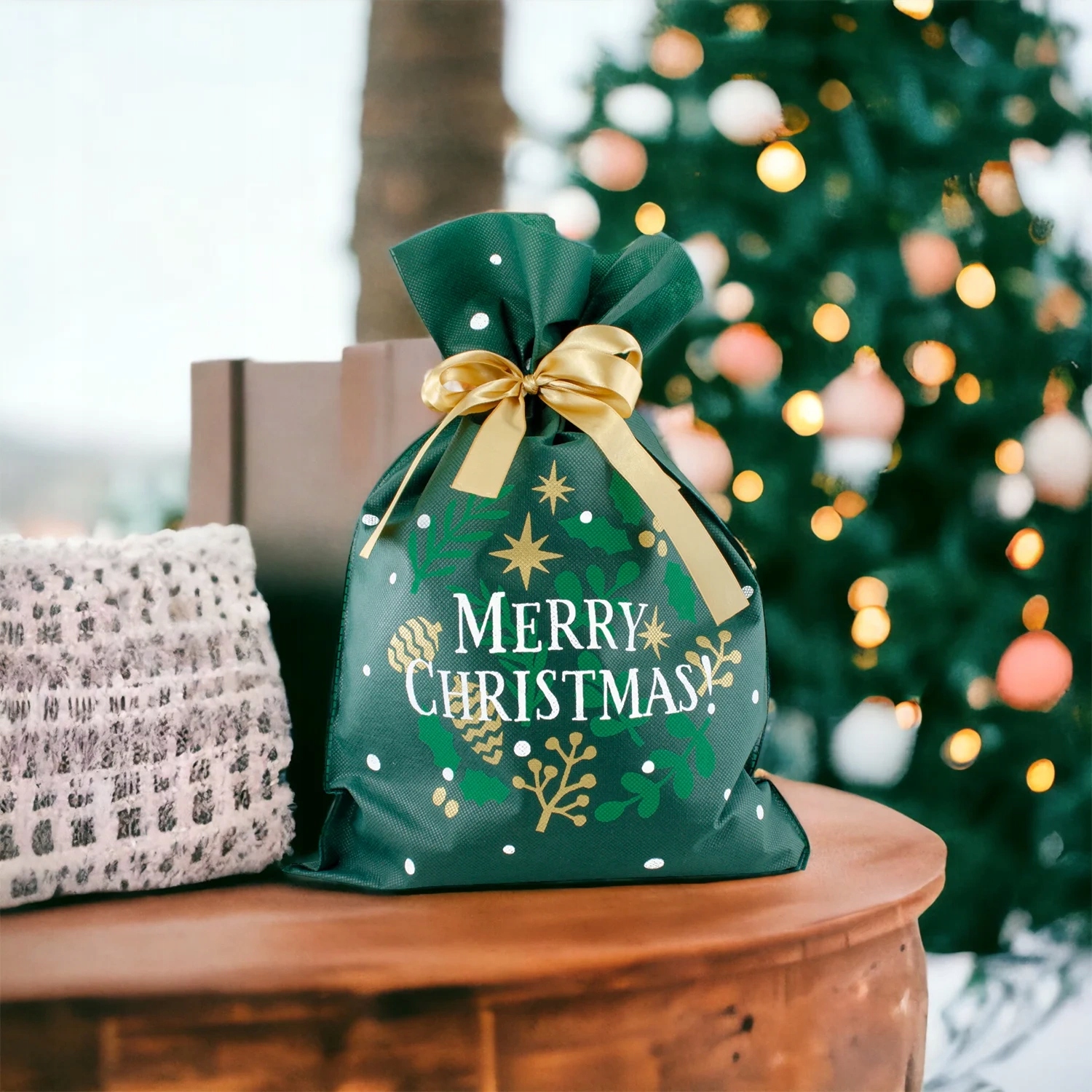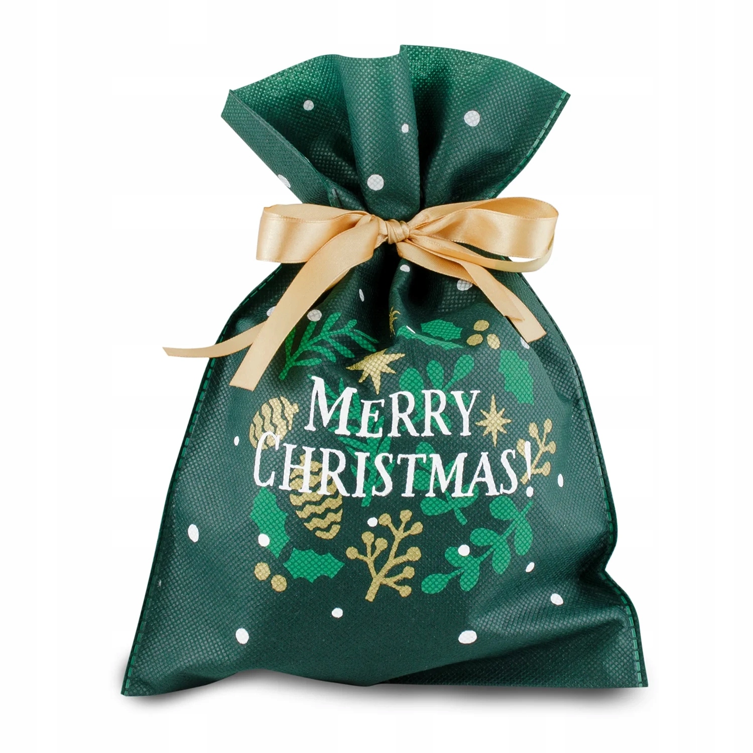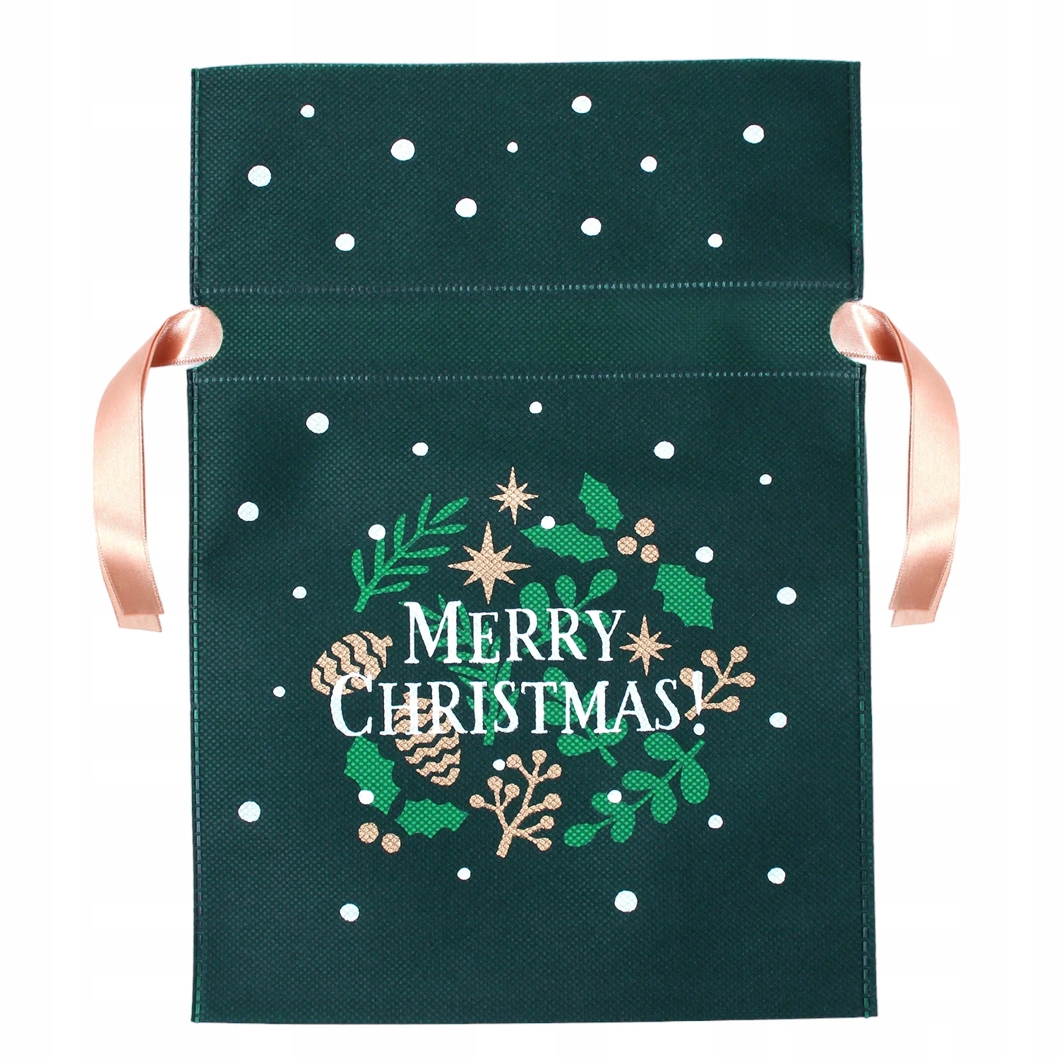 Woreczek jest wyposażony w zieloną wstążeczkę, która podkreśla świąteczny nastrój, a wytrzymały uchwyt ułatwia przenoszenie i zawieszanie torebki na choince.