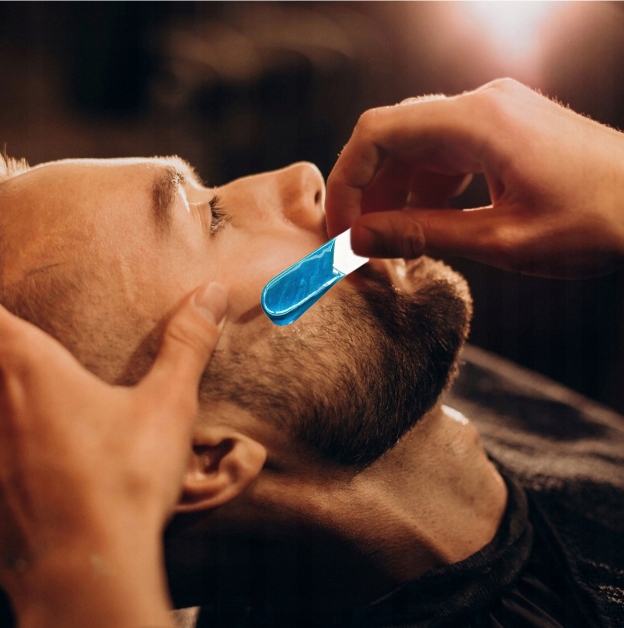 Zestaw aplikatorów LoveWax został zaprojektowany z uwzględnieniem anatomii nosa i specyfiki strefy zabiegowej. Okrągła końcówka aplikatora dopasowuje się do kształtu nozdrza i zapewnia równomierne pokrycie wosku wokół włosków; płaska końcówka tego samego aplikatora pozwala precyzyjnie pracować na płaskich powierzchniach – pod nosem, na brwiach i linii włosów. Dołączone szablony ochronne zabezpieczają skórę wąsów i zarostu przed przypadkowym kontaktem z woskiem – rozwiązanie szczególnie ważne dla mężczyzn chcących utrzymać brodę lub wąsy przy jednoczesnym usunięciu włosków z innych stref.
