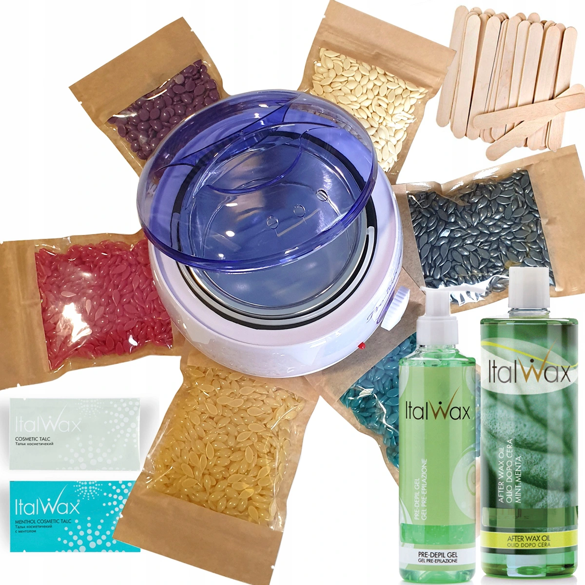 Zestaw ECO do depilacji woskiem bezpaskowym twardym 6x wosk ItalWax podgrzewacz szpatułki 2 kosmetyki talki