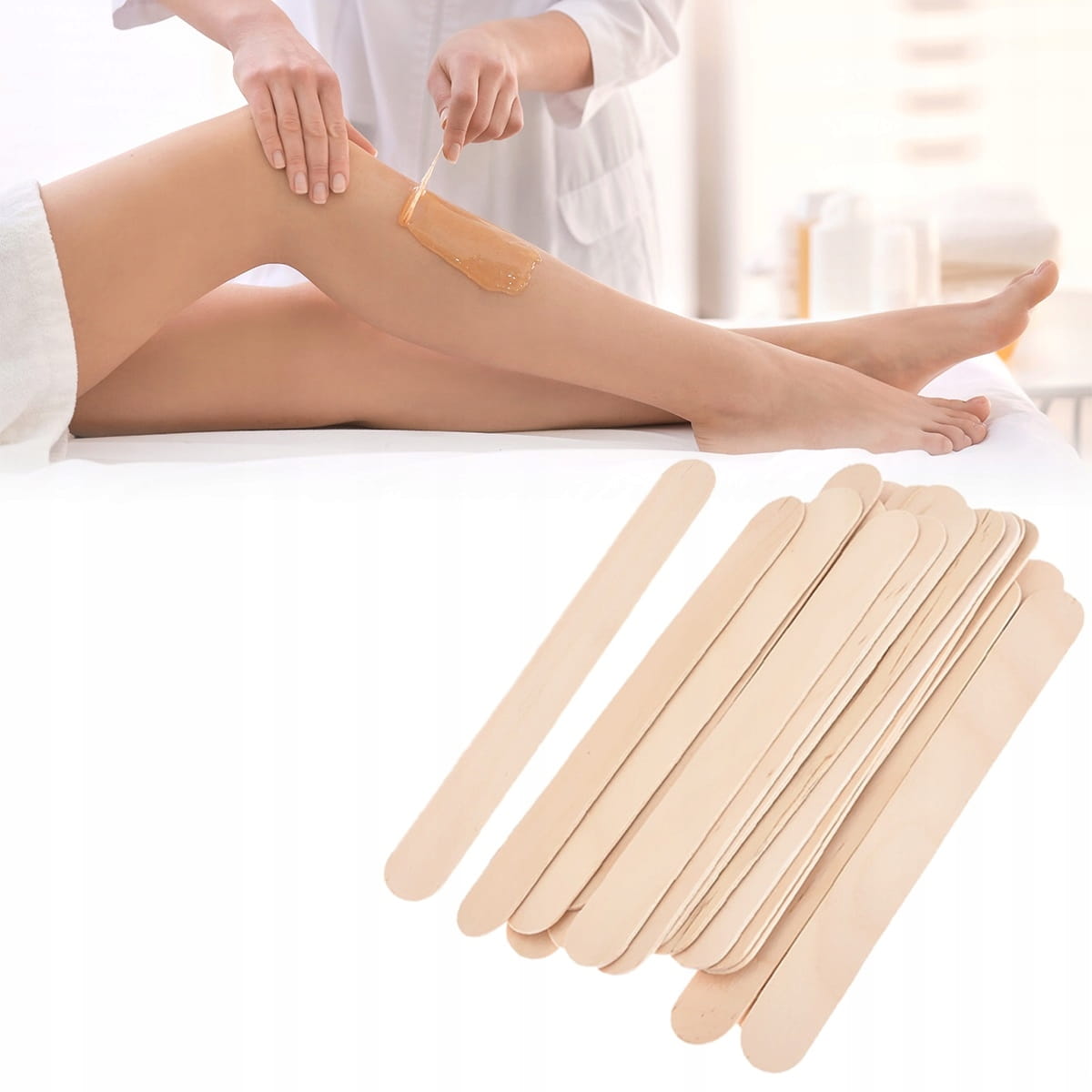 Jednorazowe drewniane szpatułki do nakładania wosku podczas depilacji.